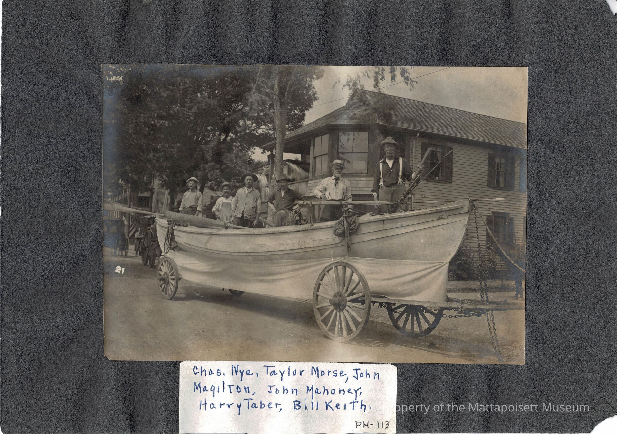 Parade floats. Right to left: Charles Nye, Taylor Morse, John Magilton, John Mahoney, Harrison Taber, William Keith.Collection