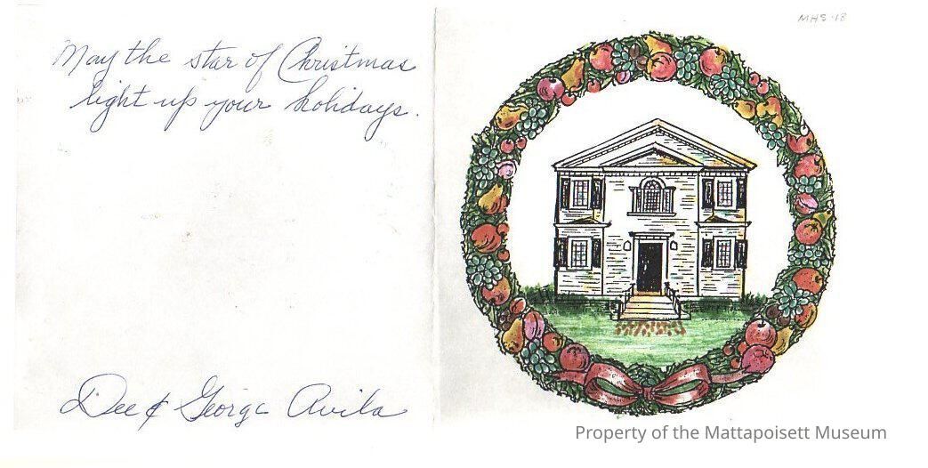 Christmas card with Mattapoisett Historical Society picture drawn on front in a wreath. From Dee & George Avila.Collection