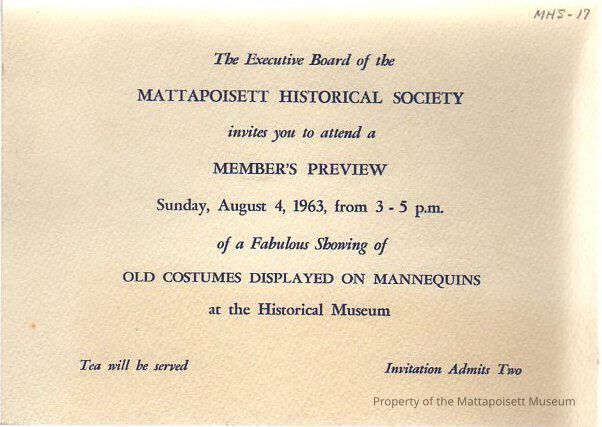 The Executive Board of the Mattapoisett Historical Society invited you to attend a Member's Preview, Sunday, August 4, 1963 of a Fabulous Showing of Old Costumes Displayed at the Museum.Collection