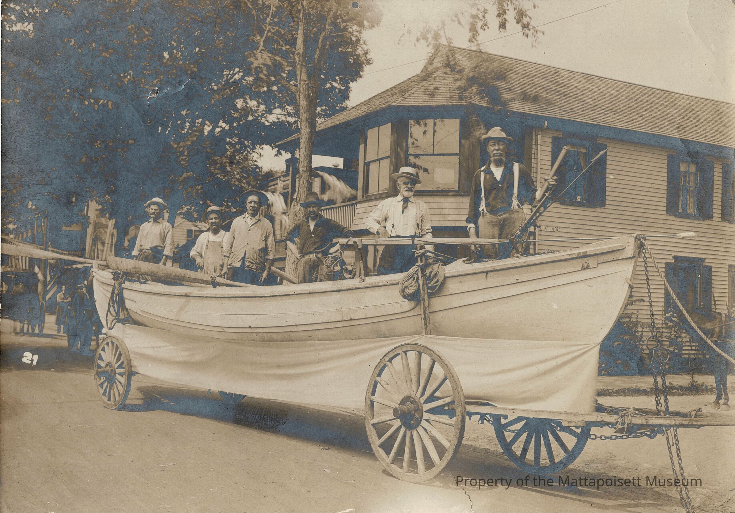Parade floats. Right to left: Charles Nye, Taylor Morse, John Magilton, John Mahoney, Harrison Taber, William Keith.Collection
