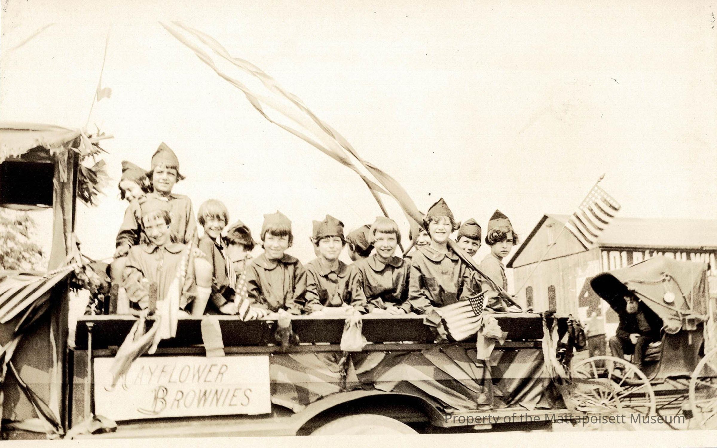 B&W photograph of the celebrations held on the 4th of July, 1928. Mayflower Brownies float.Collection