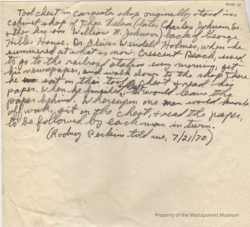 Rodney Perkins memories; tool chest in carpenter shop, Oliver Wendell Holmes & Crescent Beach.Collection