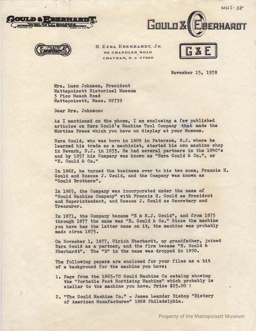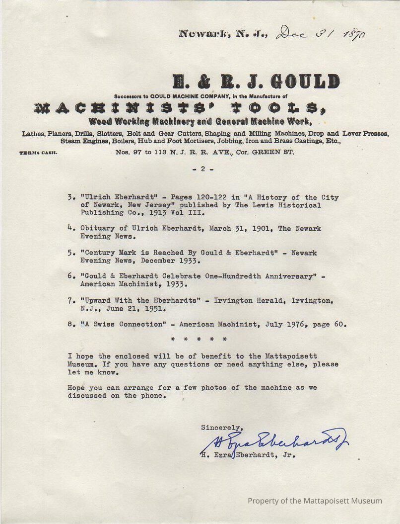 Communications with H. Ezra Eberhardt, Jr at H. & R. J. Gould, Machinists' Tools company.Collection