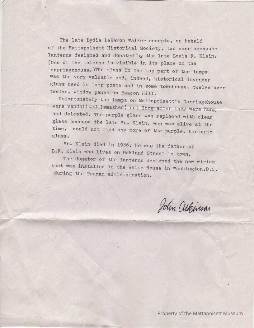 Notice about Mattapoisett Historical Society accepting carriage house lanterns on behalf of the late Lydia LeBaron Walker. Written by John Atkinson.Collection