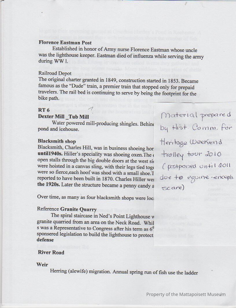 Material prepared by Historical Commission for Heritage Weekend trolley tour, 2010 (postponed until 2011 due to equine-enceph. scare)Collection