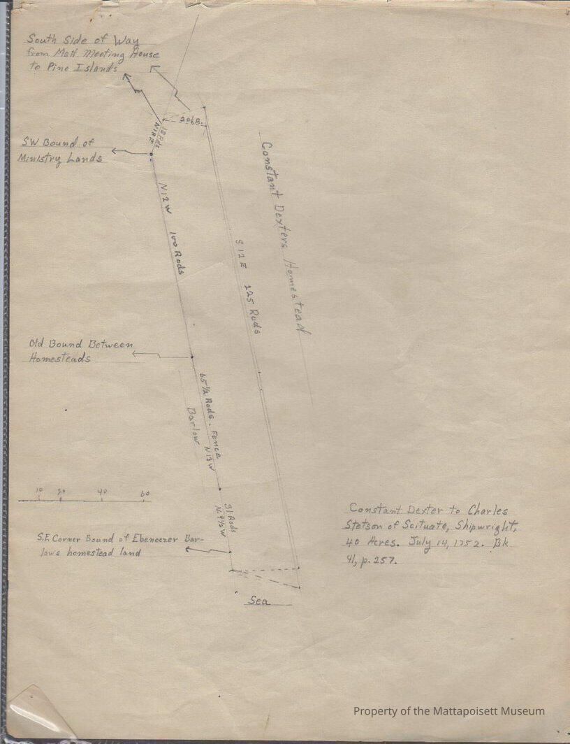 Constant Dexter to Charles Stetson of Scituate, Shipwright, 40 acres. July 14, 1752. Bk. 41, p. 257. South side of Way from Mattapoisett Meeting House to Pine Islands. Plot plan. Copy.Collection