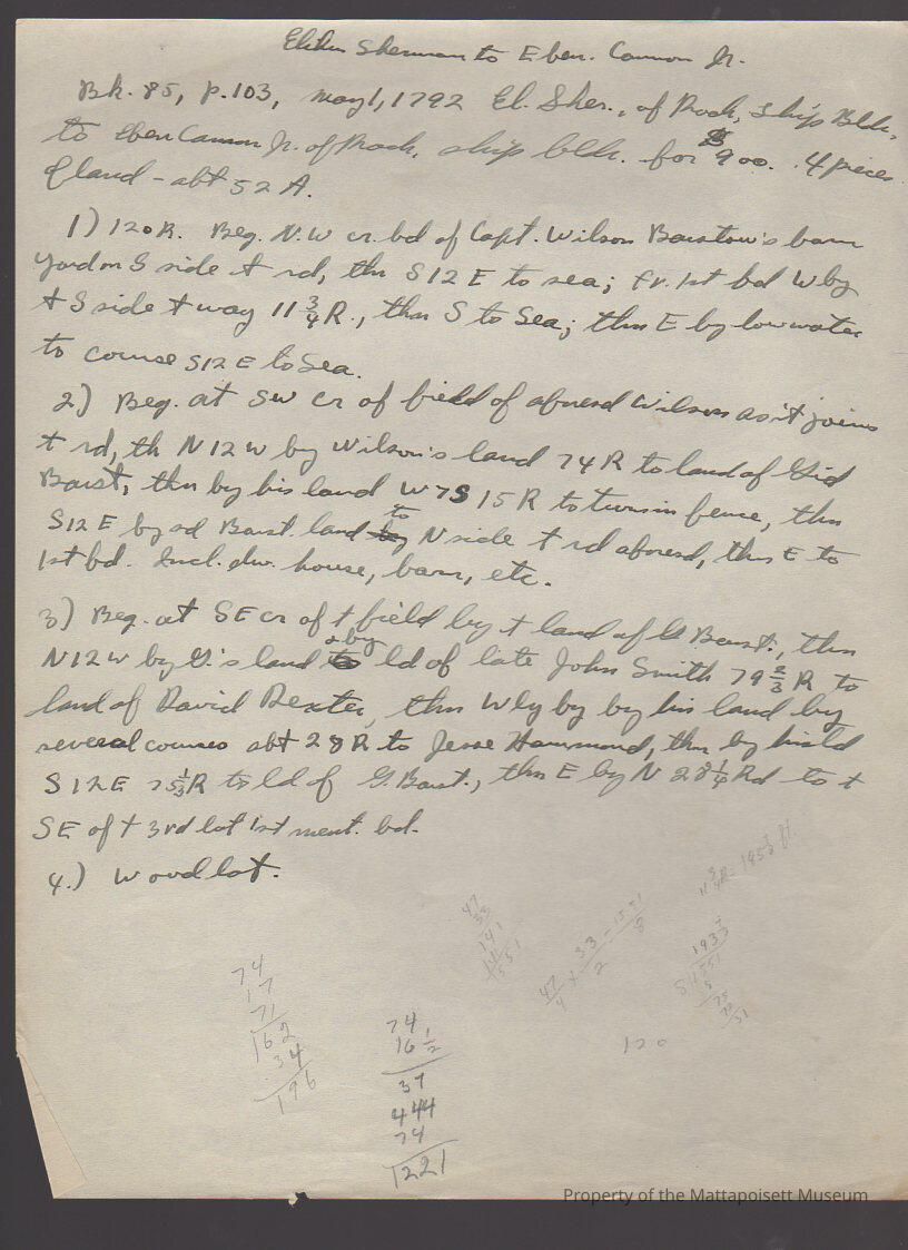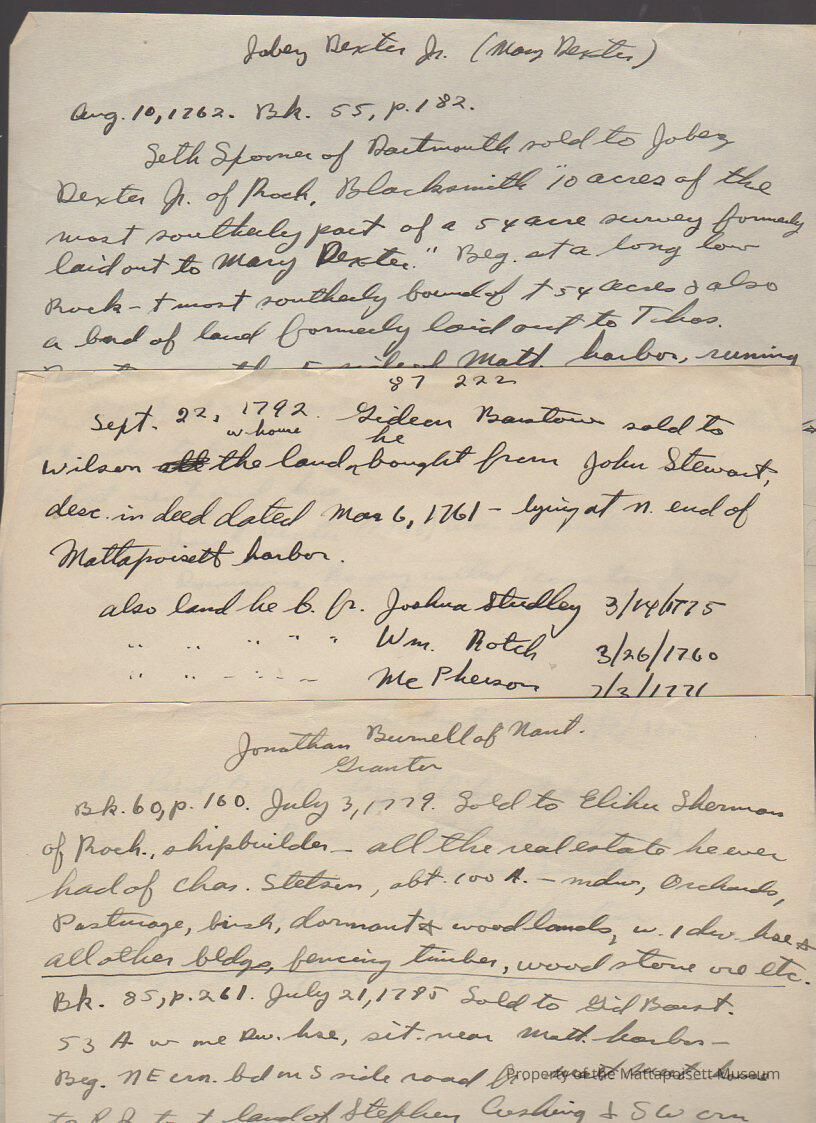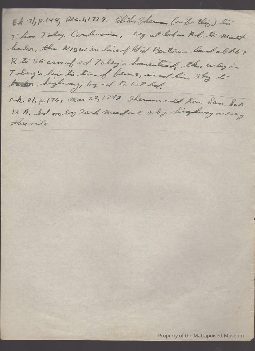 Notes about land exchanges, John Stuart, mariner sold to Joshua Snow; Nathaniel Hammond sold to Moses Hammond; Elihu Sherman sold to Ebenezer Cannon Jr.; Charles Stetson, shipwright; John Stuart, mariner; Joshua Studley, shipwright; Elihu Sherman to Thoma Tobey, cordwainer. Properties of Gideon Barstow, Elihu Sherman, Zather Cushing, Seth Barstow, Abel House, Sherman to Barstow. Jobey Dexter Jr., Gideon Barstow to Wilson, Jonathan Burnell.Collection