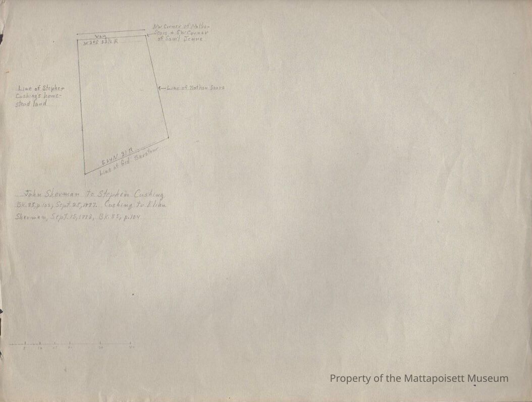 John Sherman to Stephen Cushing plot plan, Bk. 85, p. 102, September 25, 1777. Cushing to Elihu Sherman, Sept. 15, 1778, Bk. 55, p. 104. Copy.Collection