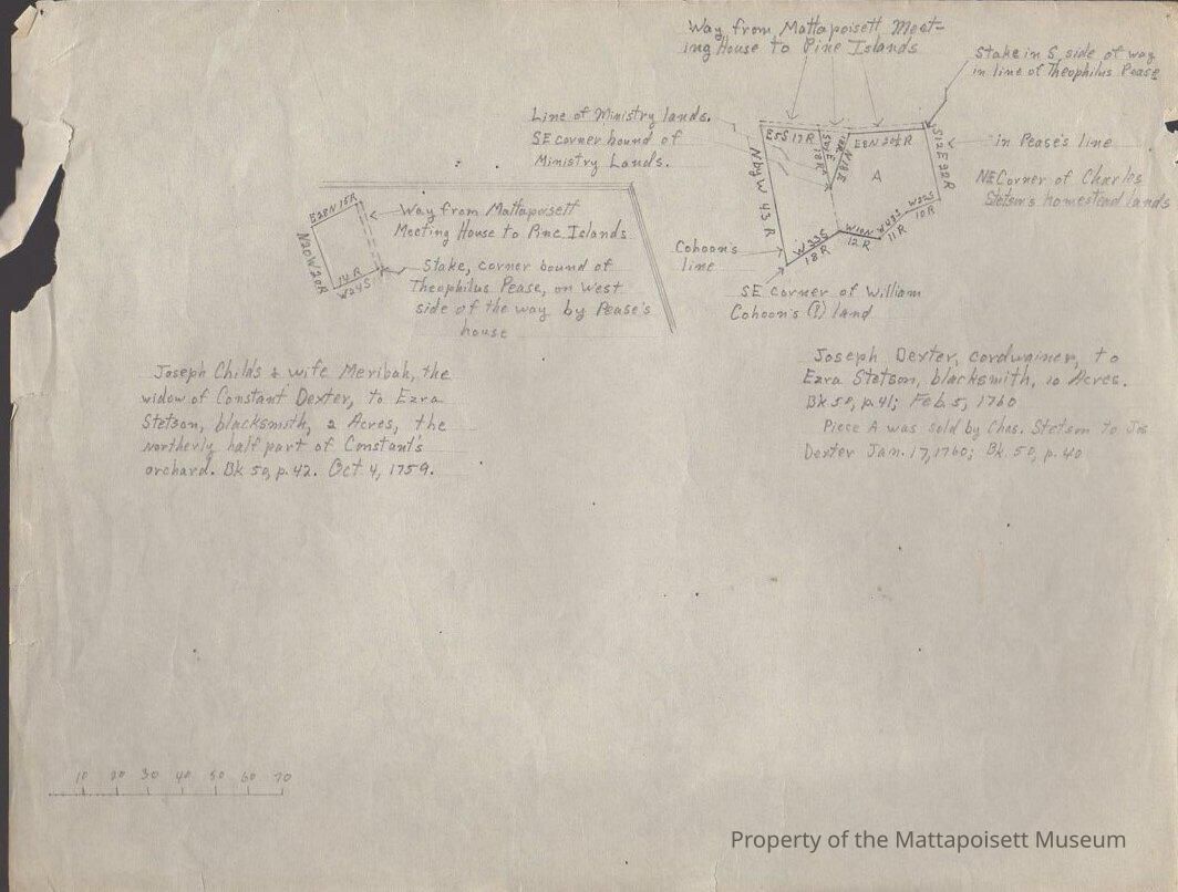 Land exchange, Joseph Childs & wife Meribah, the widow of Constant Dexter, to Ezra Stetson, blacksmith, 2 acres, the northerly half part of Constant's orchard. Bk. 50, p. 42, Oct. 4, 1759. Joseph Dexter, cordwainer, to Ezra Stetson, blacksmith, 10 acresCollection
