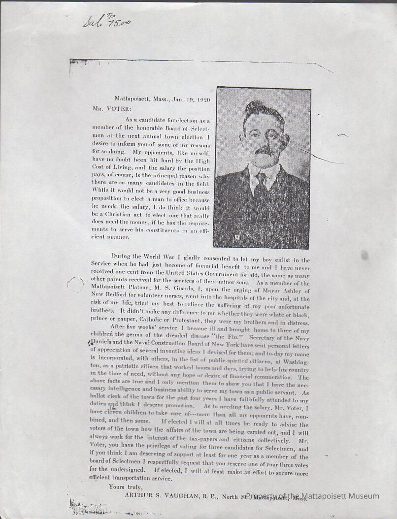 Form letter to "Voter" from Arthur S. Vaughn, candidate for member of Board of Selectment. January 19, 1920. Photocopy.Collection
