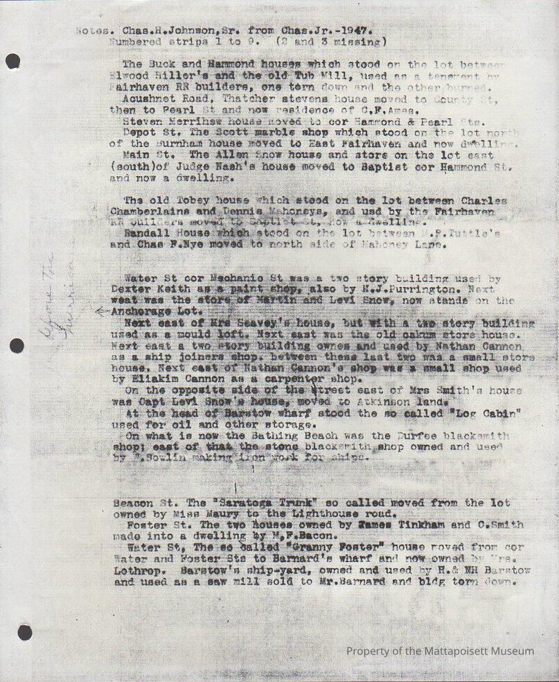 Notes of Charles H. Johnson Sr. from Charles Jr. 1947, (numbered strips 1 to 9, 2 & 3 missing).Collection