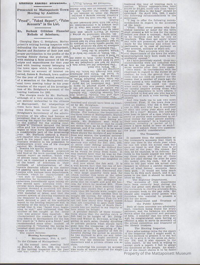 Newspaper photocopy article "Charges against [Bridgham], presented to Mattapoisett Town Meeting by Auditor."Collection