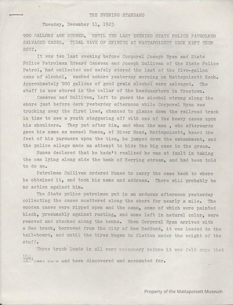 Typed pages from The Evening Standard, Tuesday, December 11, 1923, "900 Gallons are Stored. Until ten last evening state police patrolmen salvaged cases. Tidal wave of spirits at Mattapoisett Neck kept them busy."Collection
