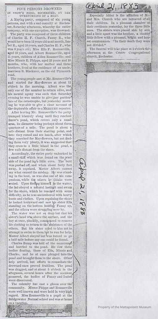 Newspaper photocopy article "Five persons drowned" in Snow's Pond, Rochester, by the overturning of a boat.Collection