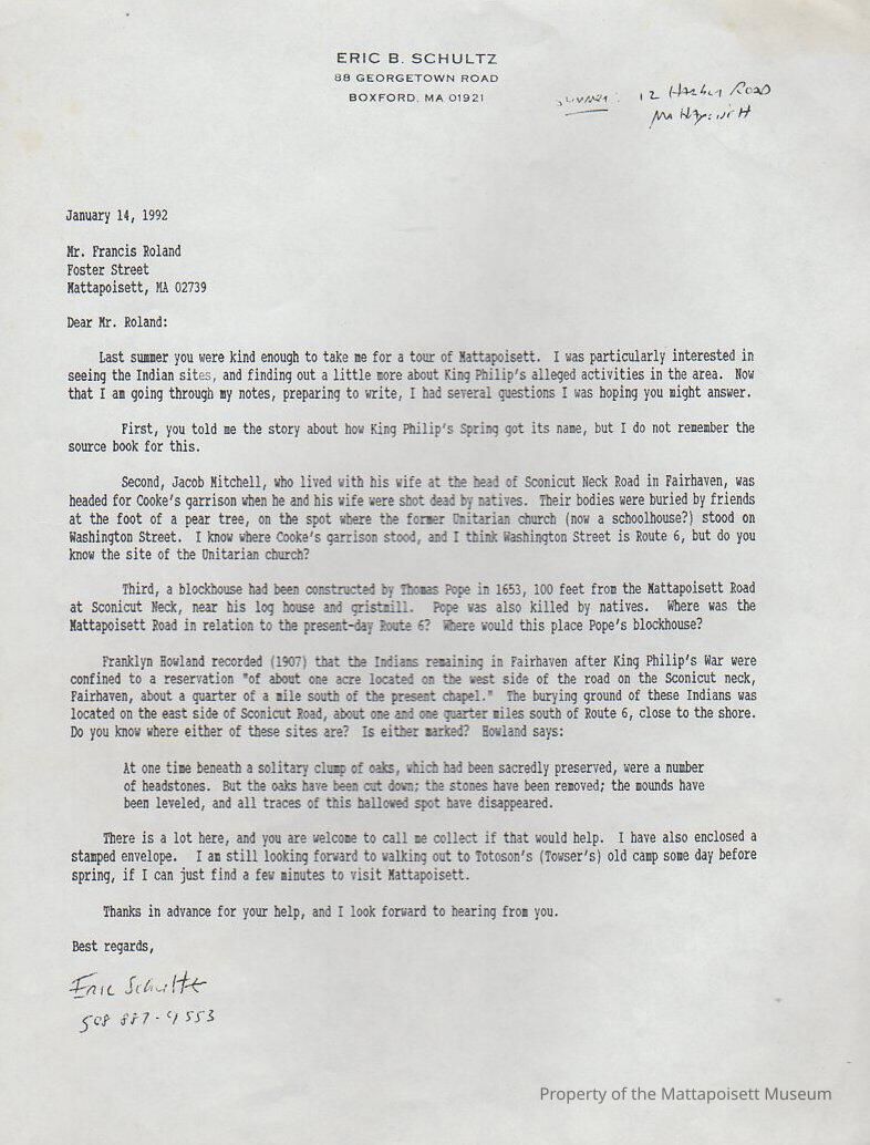 Letter to Francis Roland from Eric B. Schultz, King PhilipCollection