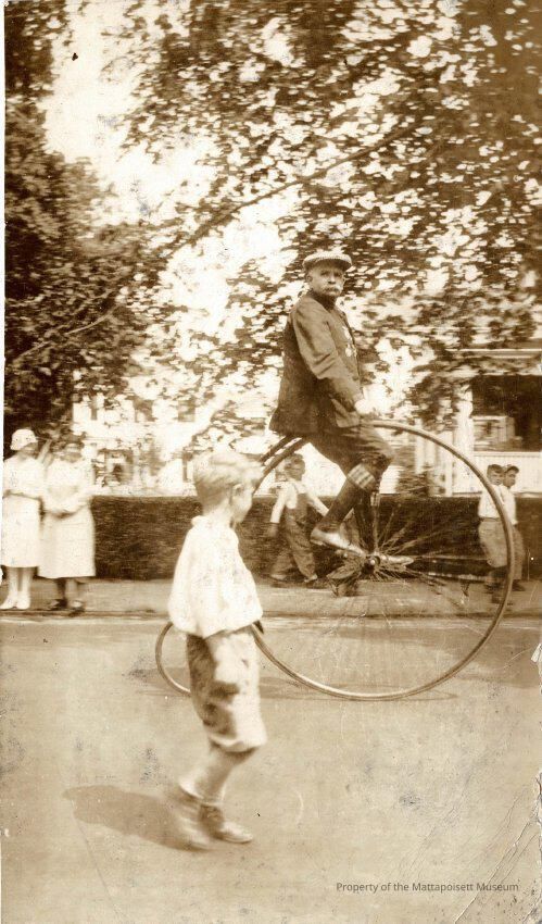 B&W photograph of celebrations in Mattapoisett. Precise date and event is unclear. Major Gibbs on bicycle.Collection