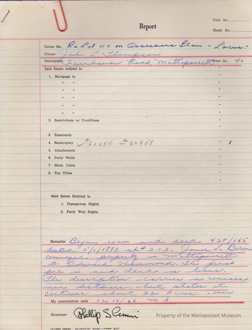 Report of Lot 110 on Assessor's Plan, owner John L. Thompson on Fairhaven Road.Collection