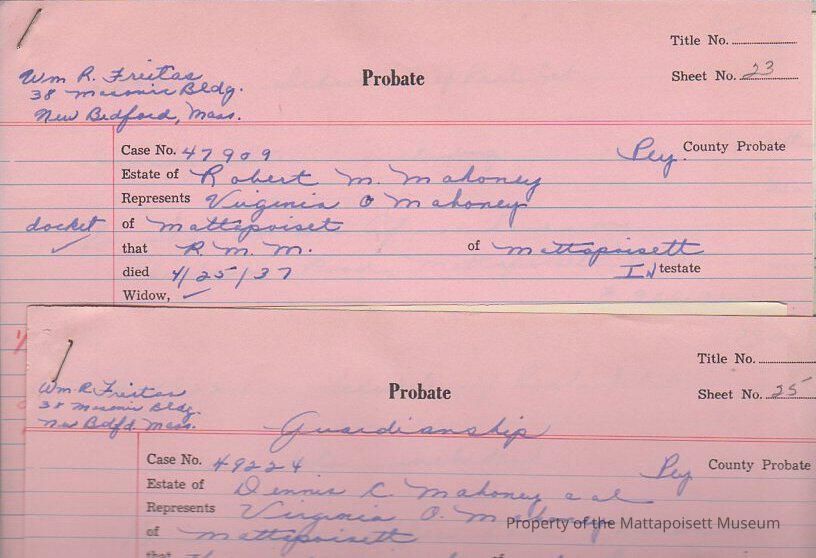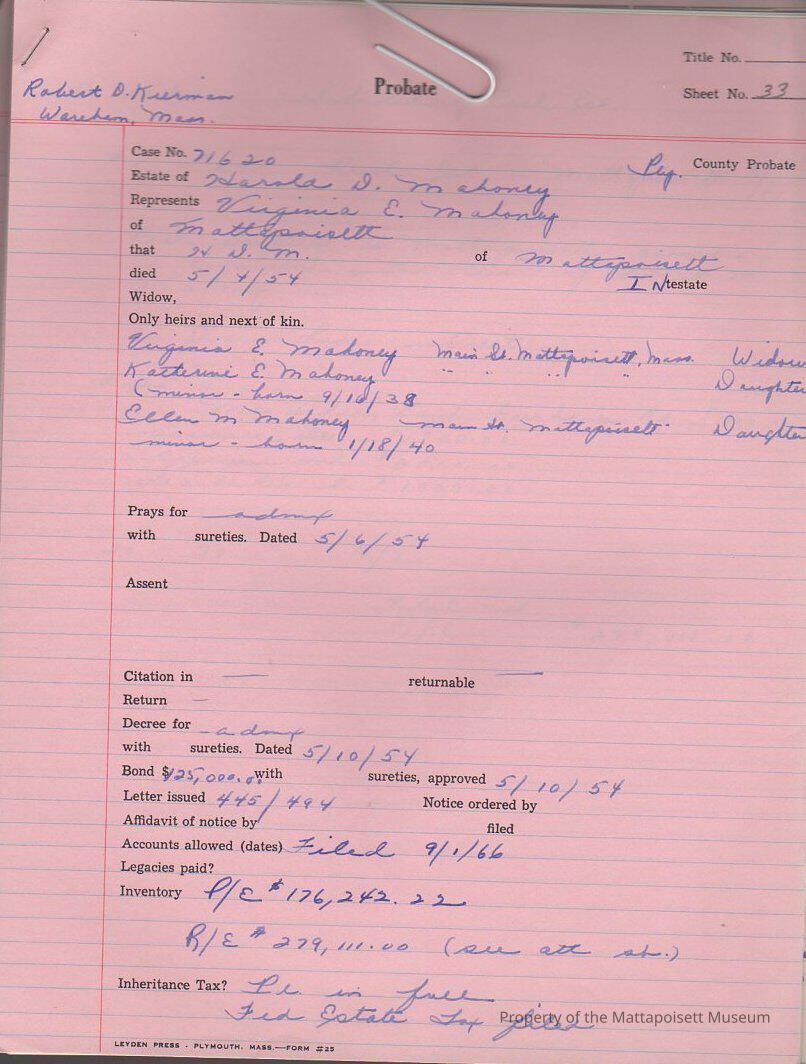 Probate on Estate of Harold D. Mahoney/Robert M. Mahoney represents Virginia Mahoney.Collection