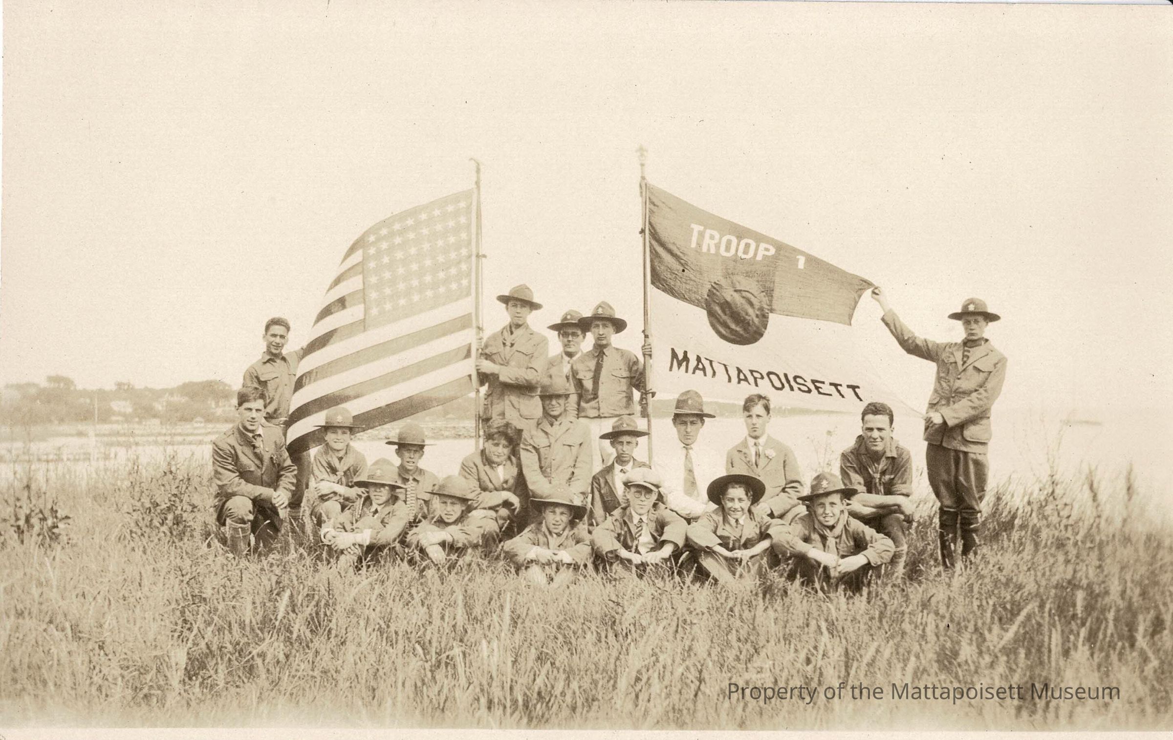 B&W photograph of celebrations in Mattapoisett. Precise date and event is unclear. Boy Scouts, including Joe Bauer (front with glasses), Edward D. Kinney (5th from left), and William Ellis (far right sitting).Collection