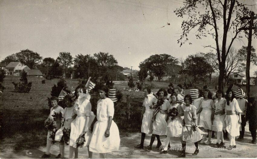 B&W photograph of celebrations in Mattapoisett. Precise date and event is unclear.Collection