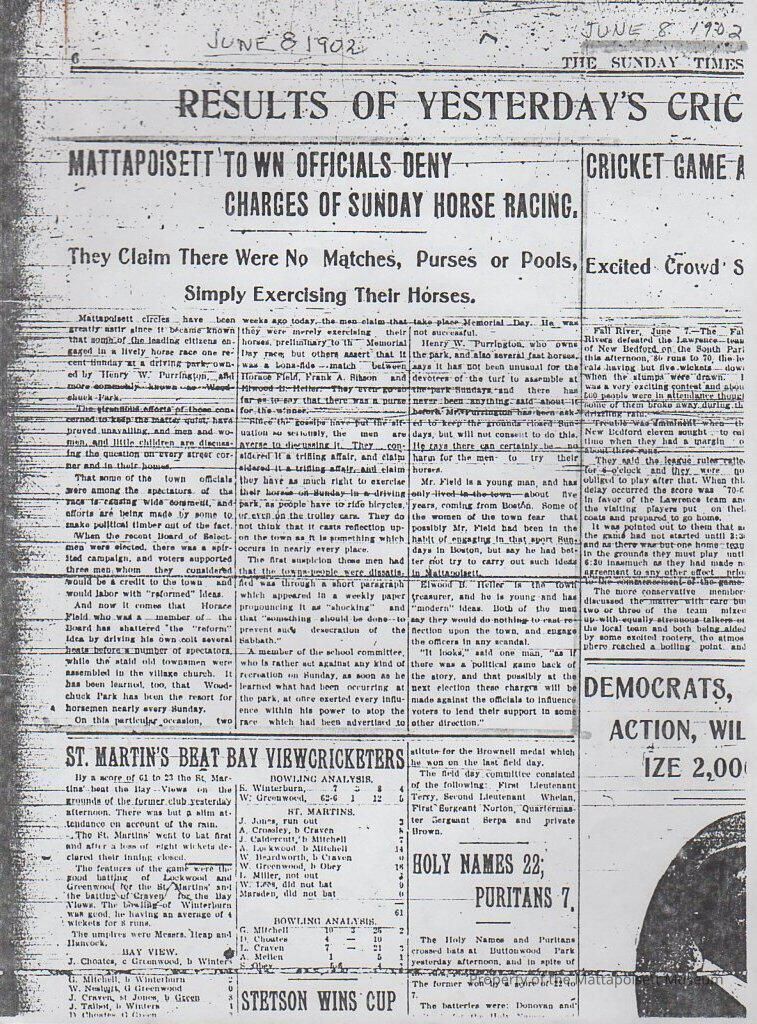 Newspaper copy "Mattapoisett Town Officials Deny Charges of Sunday Horse Racing" They claim there were no matches, purses or pools simply exercising their horses.Collection