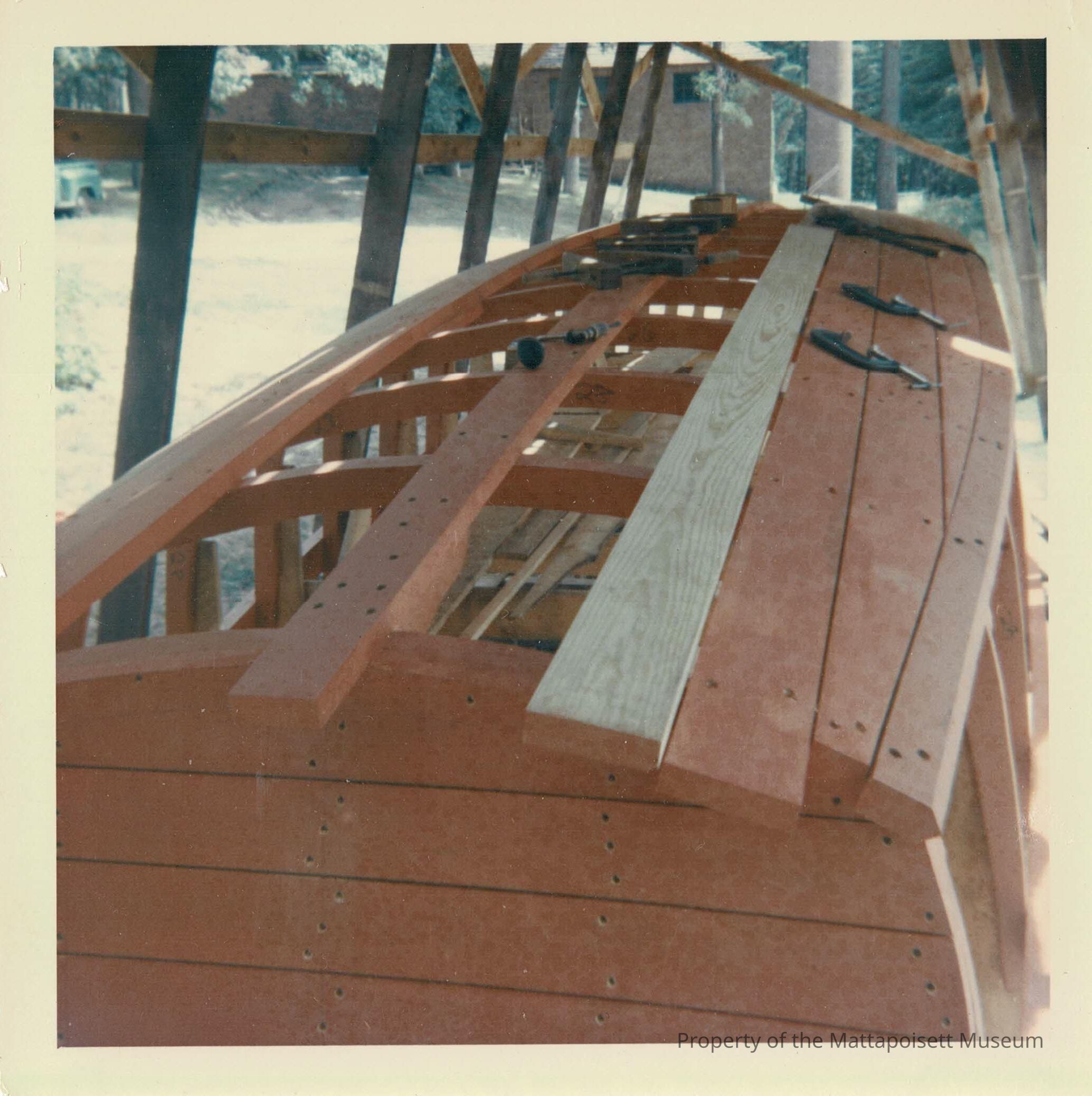 Photo of the 'Hekate', an Allan Vaitses-designed Meadowlark, being built by Seth Mendell at Avon Old Farms School, c. 1965-1970.