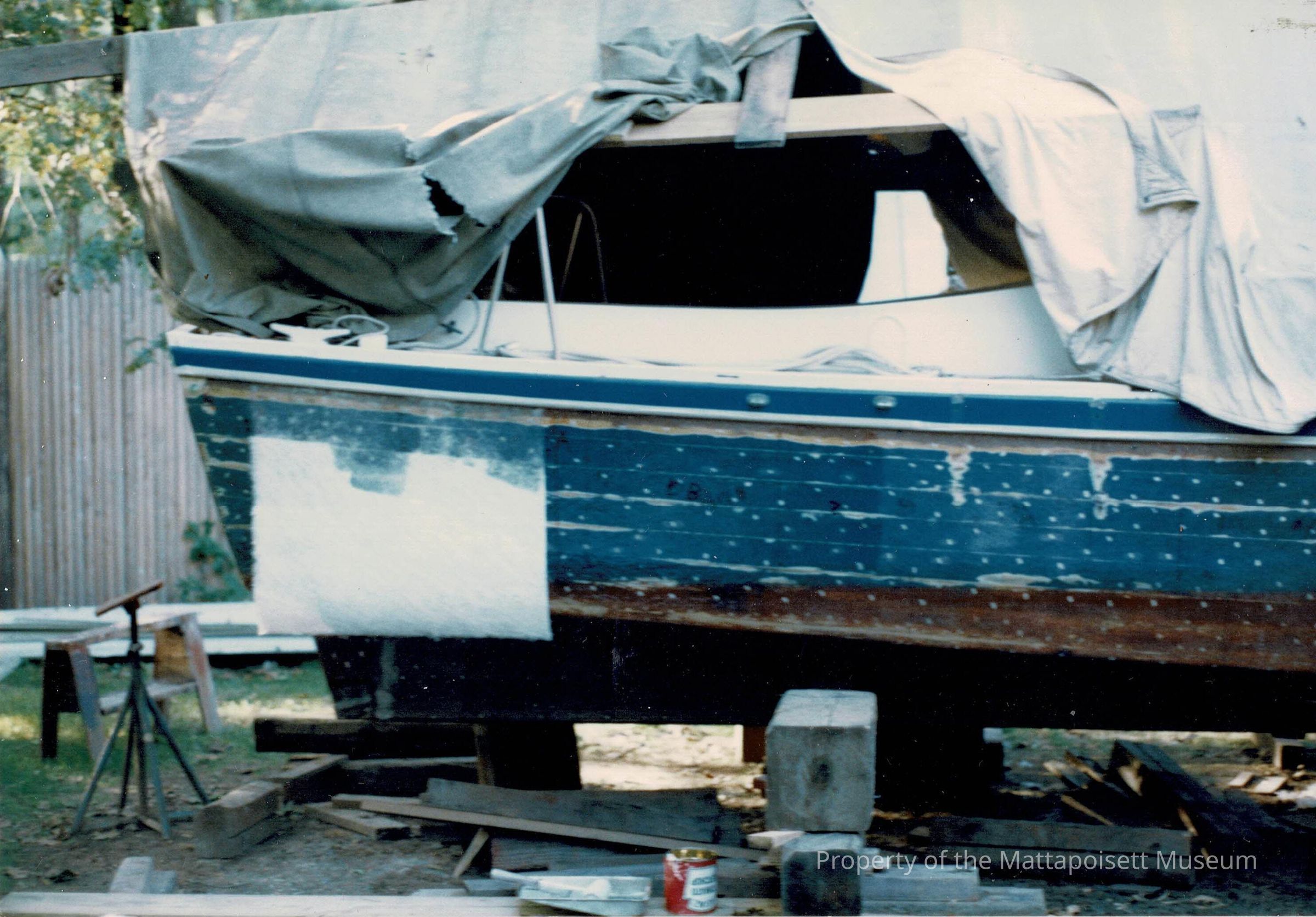 Photo of the 'Hekate', built by Seth Mendell, being fiberglassed via the Vaitses Method, c. 1988-1990.