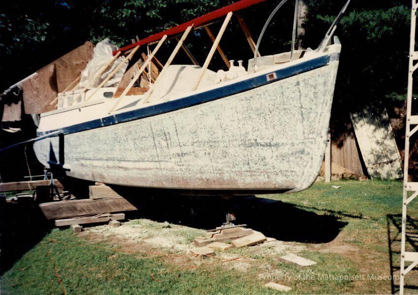 Photo of the 'Hekate', built by Seth Mendell, being fiberglassed via the Vaitses Method, c. 1988-1990.