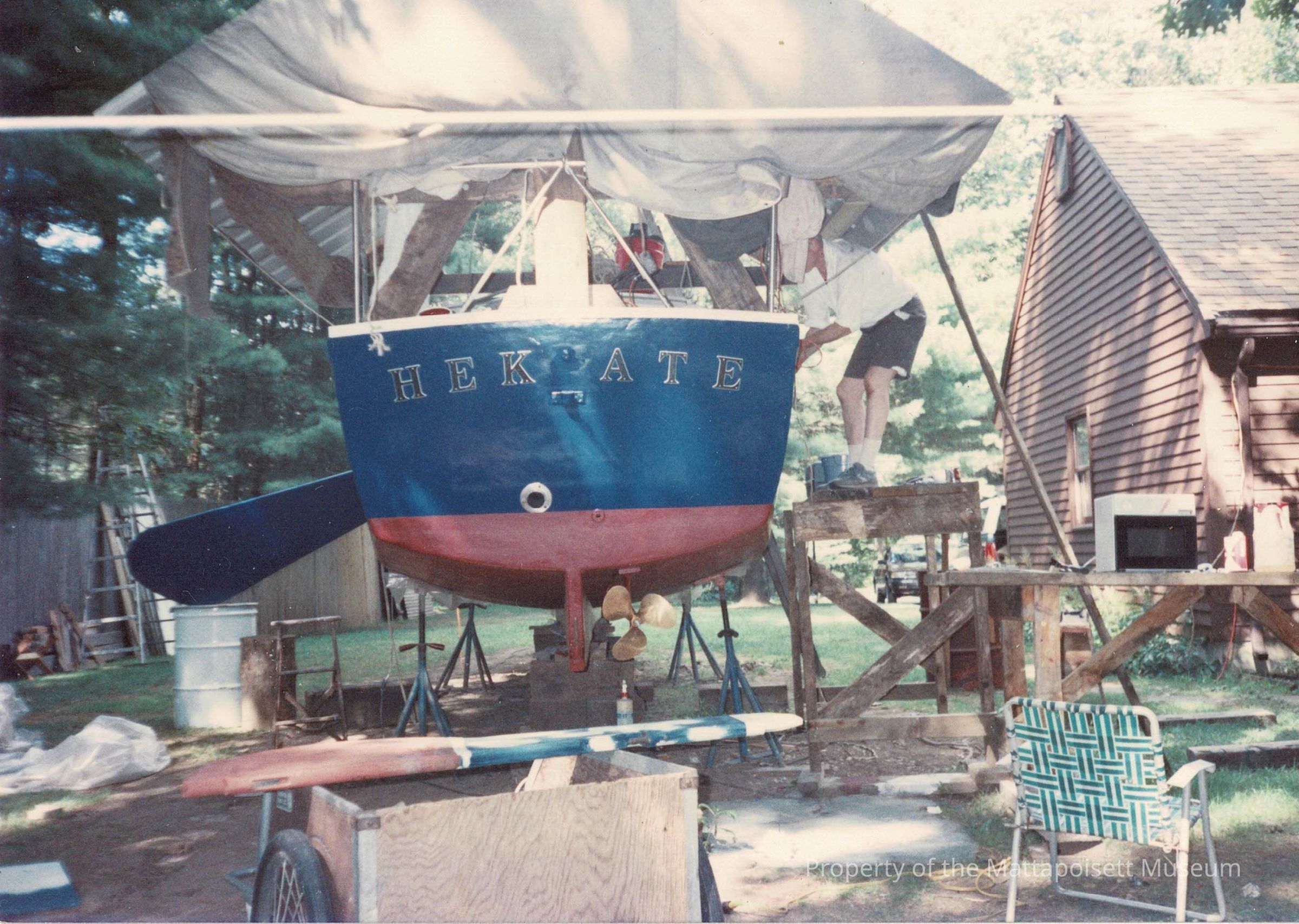 Photo of the 'Hekate', built by Seth Mendell, being fiberglassed via the Vaitses Method, c. 1988-1990.