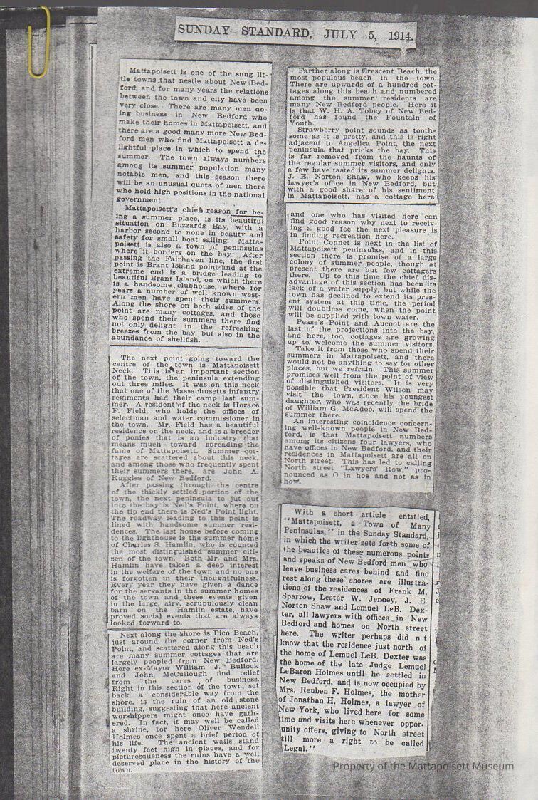 Standard newspaper copy article - 2 images - Image 1 Sunday Standard, July 5, 1914 articles pertaining to Mattapoisett one of the snug little towns that nestle about New Bedford. Image 2 titled Four New Bedford Lawyers All Reside on North Street in the Town.Collection