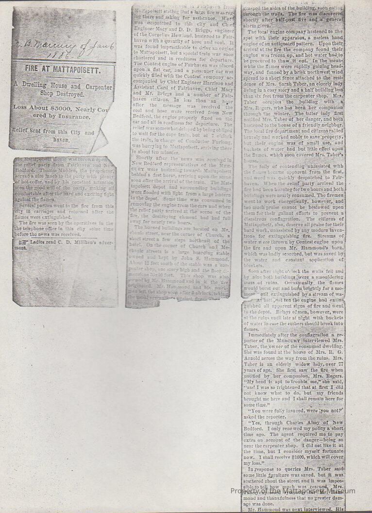 Mercury newspaper copy "Fire at Mattapoisett" A dwelling house and carpenter shop destroyed. Loss about $5,000, nearly covered by insurance.Collection