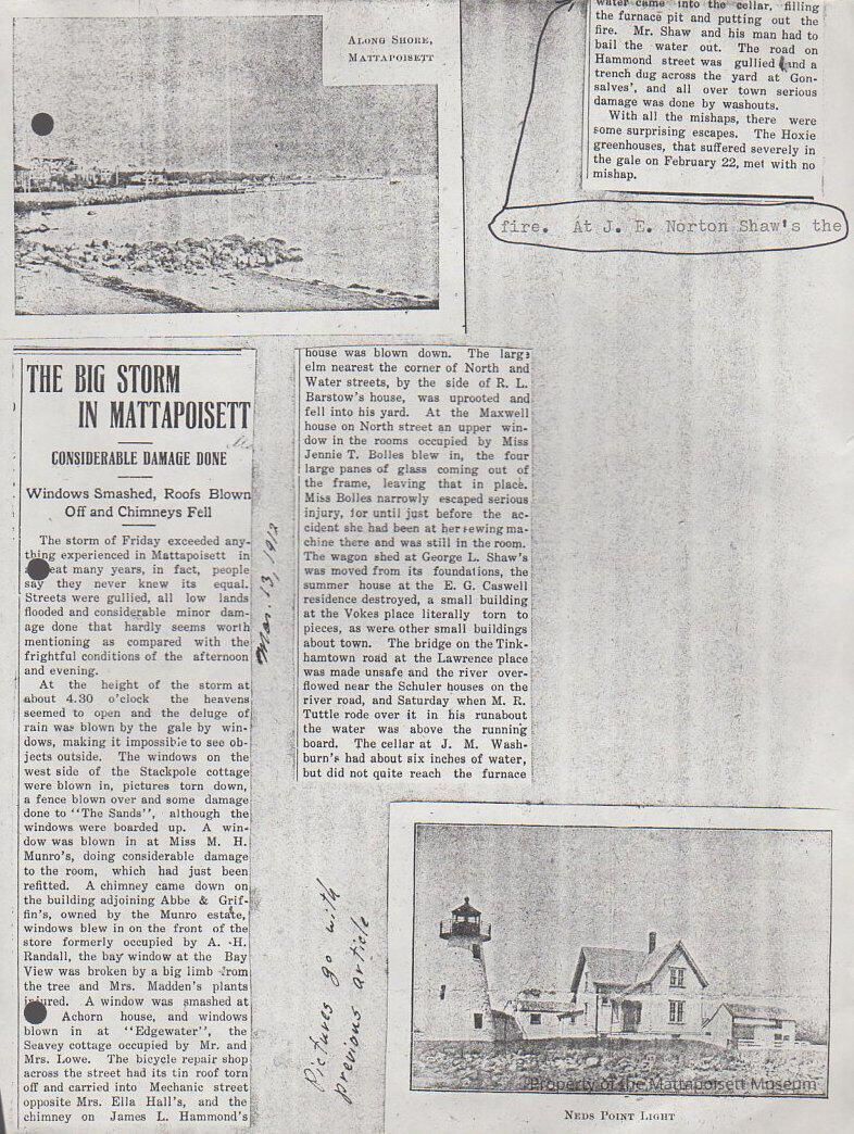 Newspaper copy "The Big Storm in Mattapoisett" Considerable damage done. Windows smashed, roofs blown off and chimneys fell.Collection