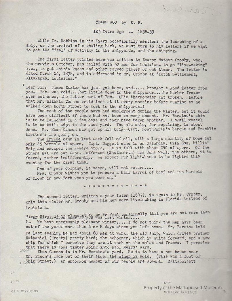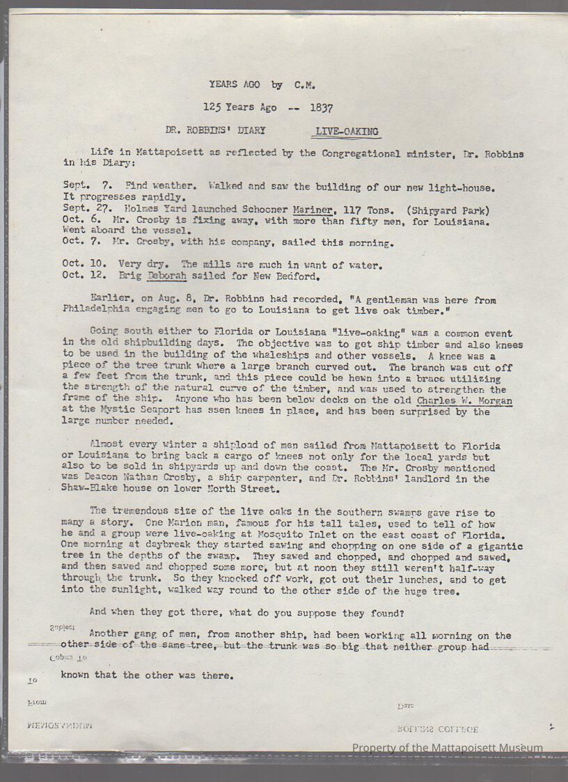Life in Mattapoisett as reflected by the Congregational minister, Dr. Robbins in his diary. Years Ago, by C. M. 125 years ago, 1837, 1838-1839.Collection