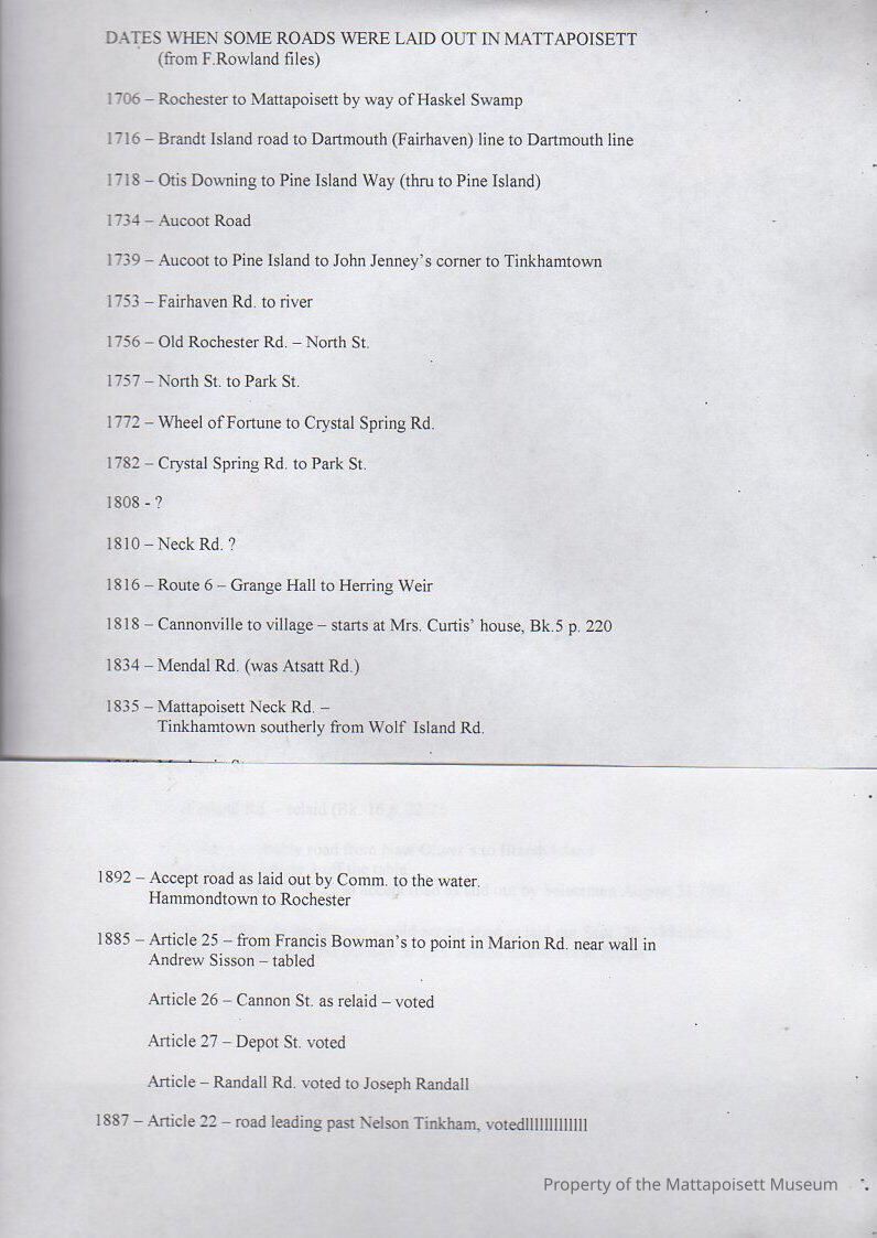 Dates when some roads were laid out in Mattapoisett, from F. Rowland files (5 pages).Collection