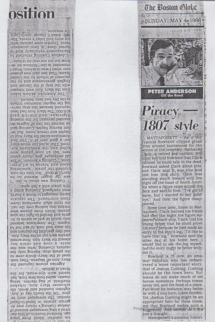 Newspaper copy "Piracy - 1807 style" Story of Joshua Cushing.Collection