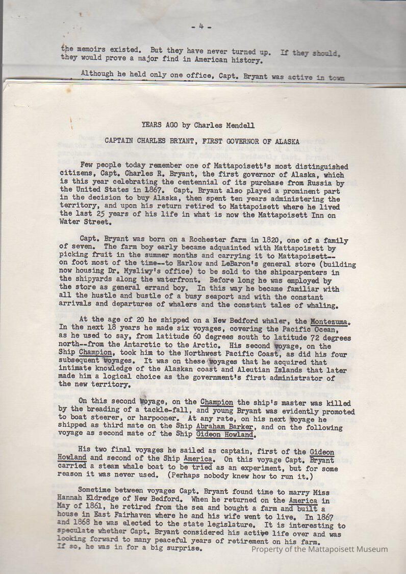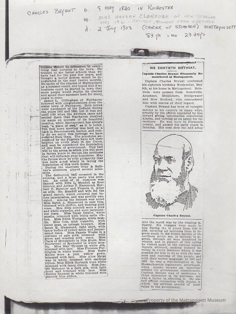 Newspaper copy about Charles Bryant "His Eightieth Birthday", Captain Charles Bryant pleasantly remembered at Mattapoisett. "Years Ago" by Charles Mendell, Captain Charles Bryant, first govenor of Alaska.Collection