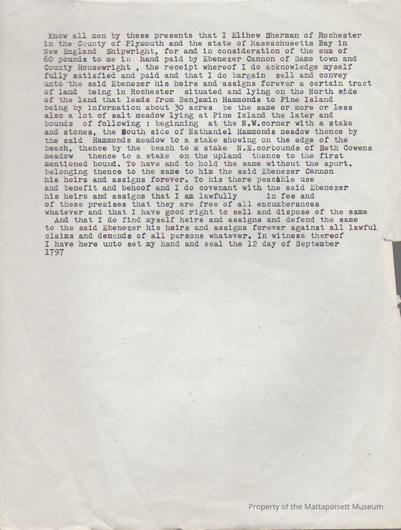 Transcript of land transfer between Elihew Sherman and Ebenezer Cannon.Collection