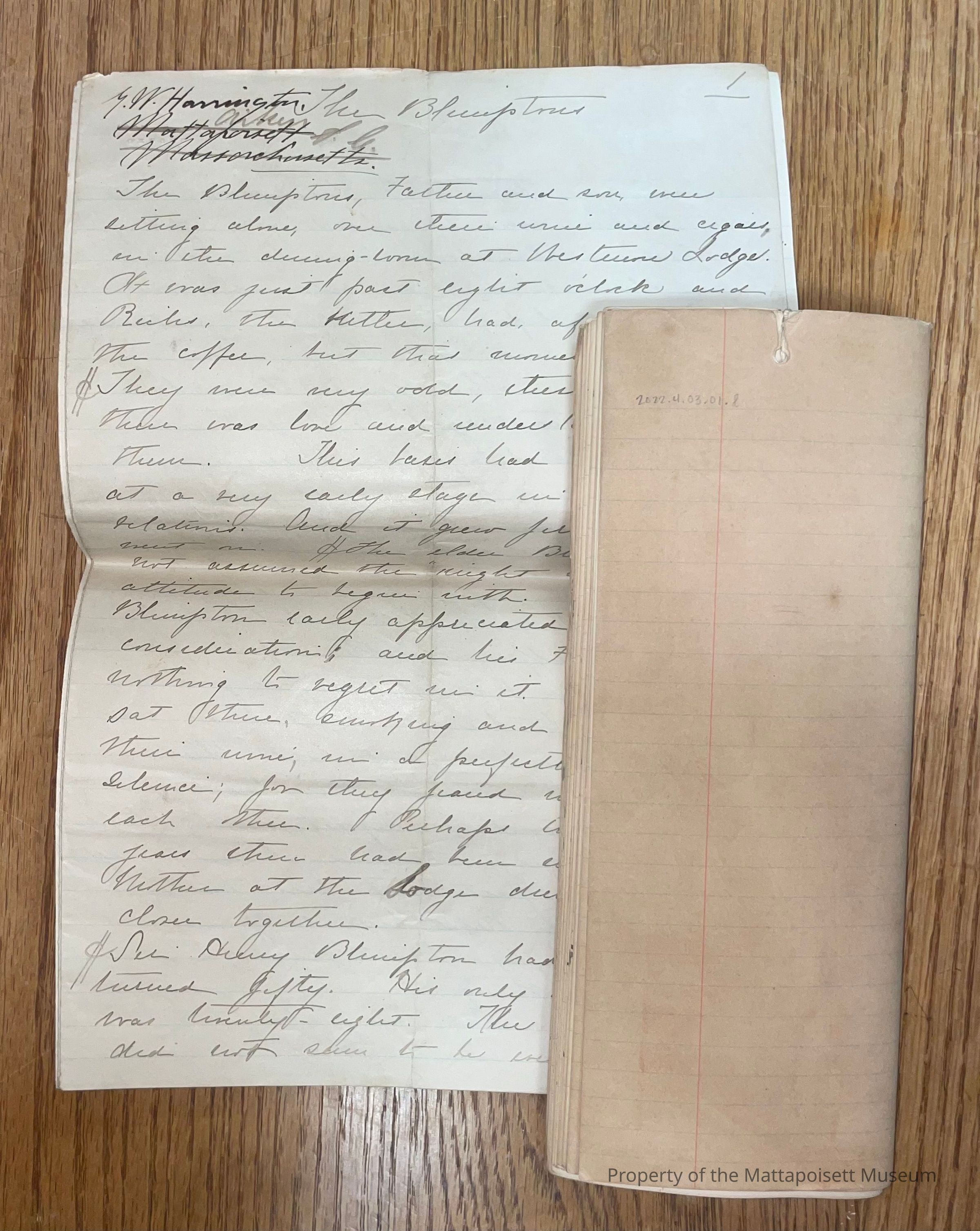 Harrington is a published author who spent his summers writing in Mattapoisett. The first book he published was a short story collection about horses called "A Reversion of Form" in 1911. 2022.4.03 is the manuscript series.