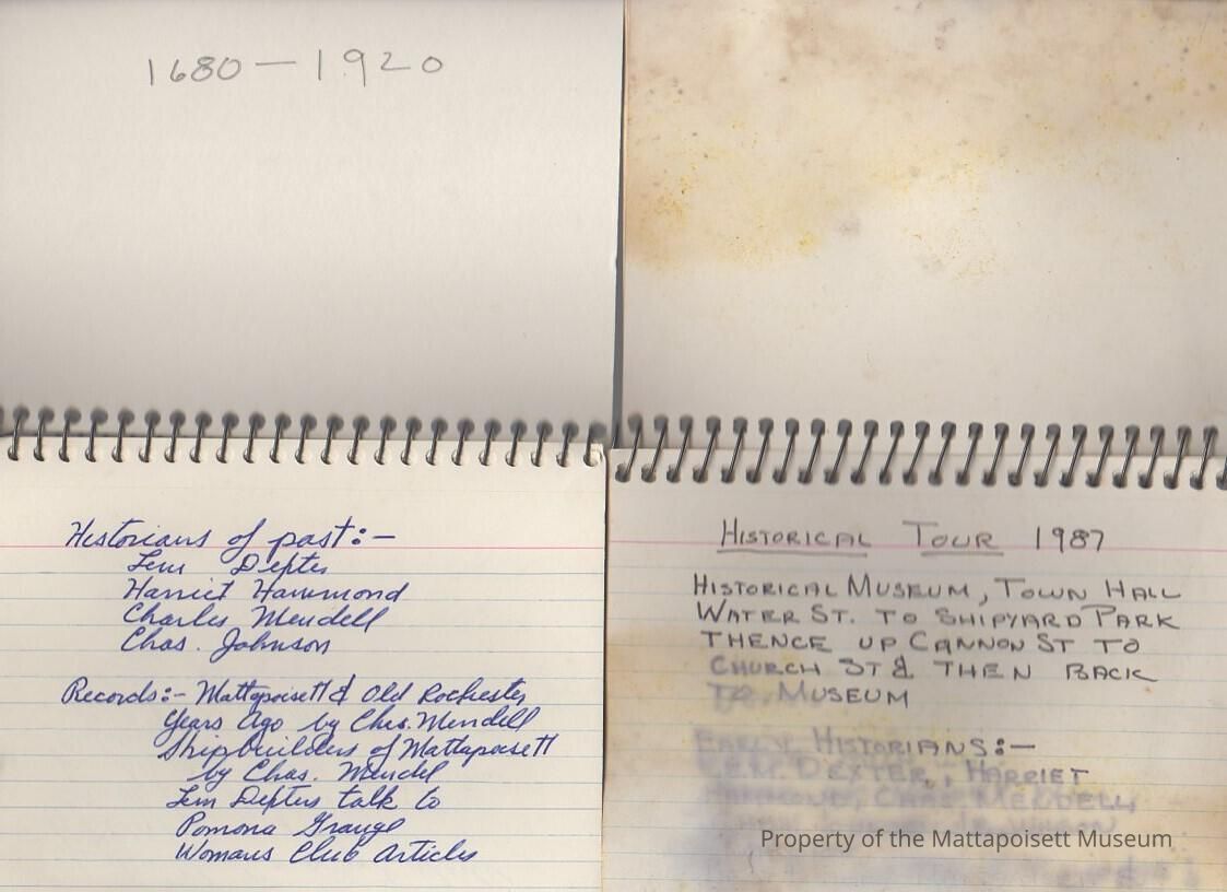 Notebooks of Historis of the Past, Lem. Dexter, Harriet Hammond, Charels Mendell, Charles Johnson, etc. Historical Tour; Museum, Town hall, Water St. to Shipyard Park, Churh St. back to Museum.Collection