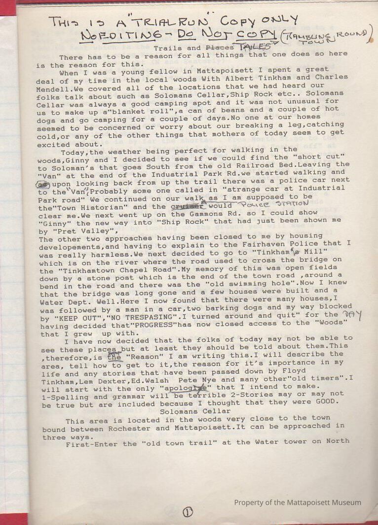 Trial Run of "Trails and Tales". Do Not Copy (located in red notebook and titled "Historical Info".Collection