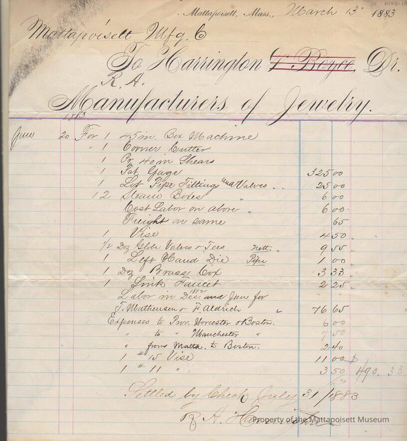 Receipt for Mattapoisett Manufacturing Co. to R. A. Harrington, manufacturers of jewelry.Collection