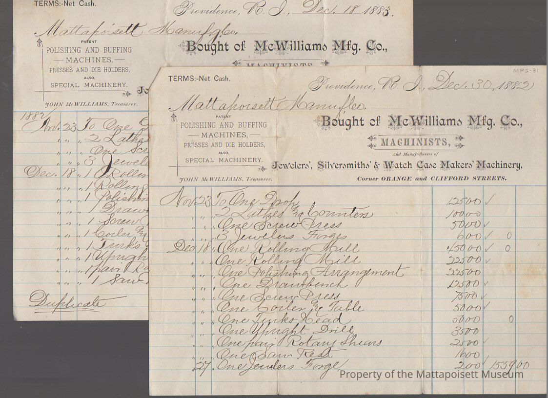 Receipt from McWilliams Manufacturing to Mattapoisett Manufacturing Co.Collection