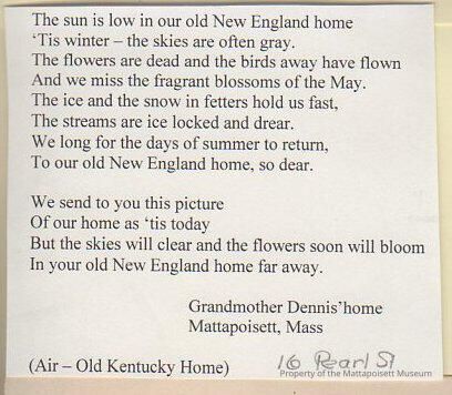 Poem "The sun is low our old New England home", Grandmother Dennis' home in Mattapoisett, 16 Pearl St.Collection