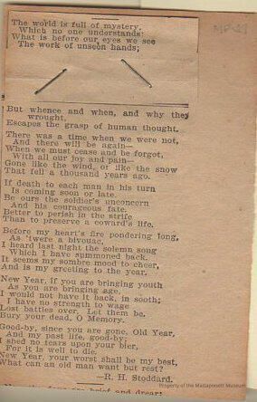 Poem in newspaper "The world is full of mystery/Which no one understands/What is before our eyes we see/The work of unseen hands" R. H. Stoddard.Collection