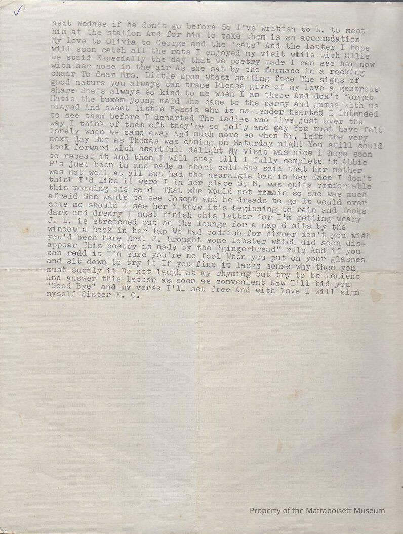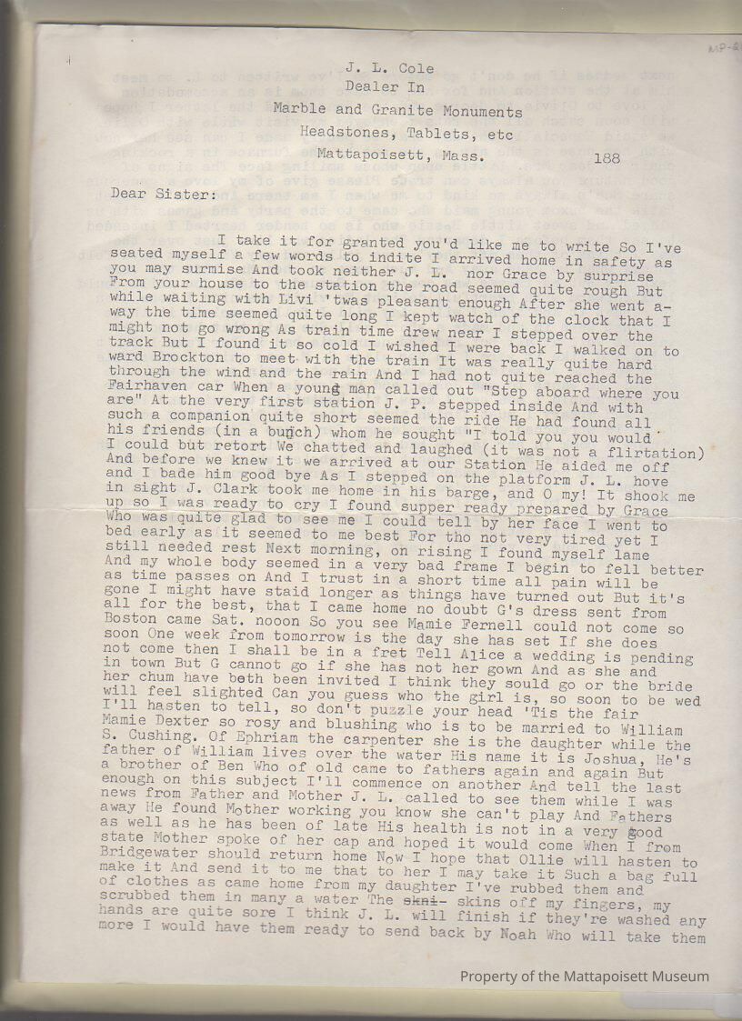 Letter to "Sister" from E. C. [Eunice Cole], note: J. L. Cole, dealer in marble and granite monuments headstones, tablets, etc.Collection