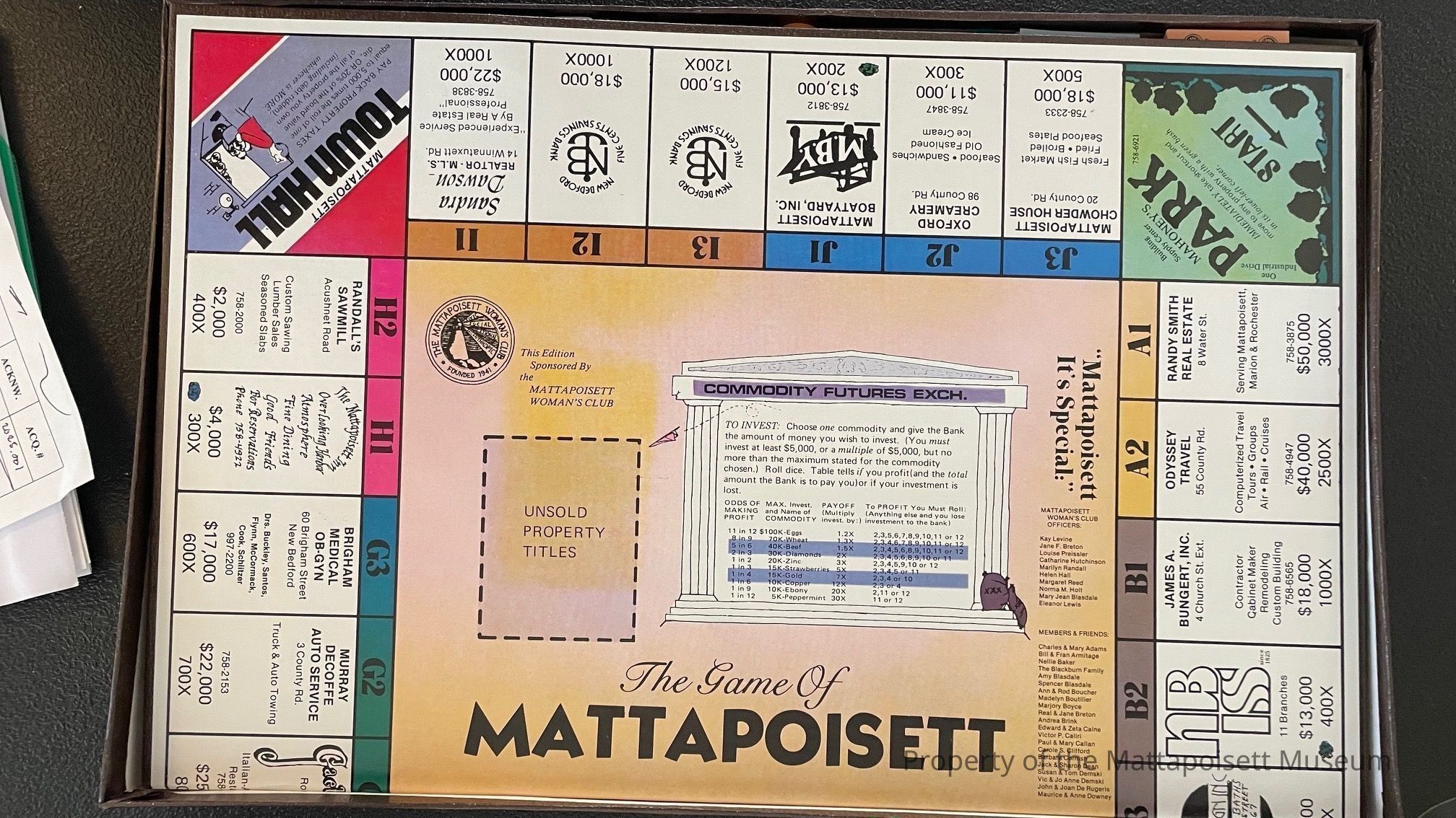 1980 edition of Monopoly-like game of Mattapoisett. Made to sell for Mattapoisett Women's Club fundraiser.Acquisition