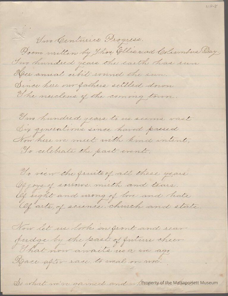 Poem "Two Centuries Progress", poem by Thomas Ellis read for Columbus Day.Collection