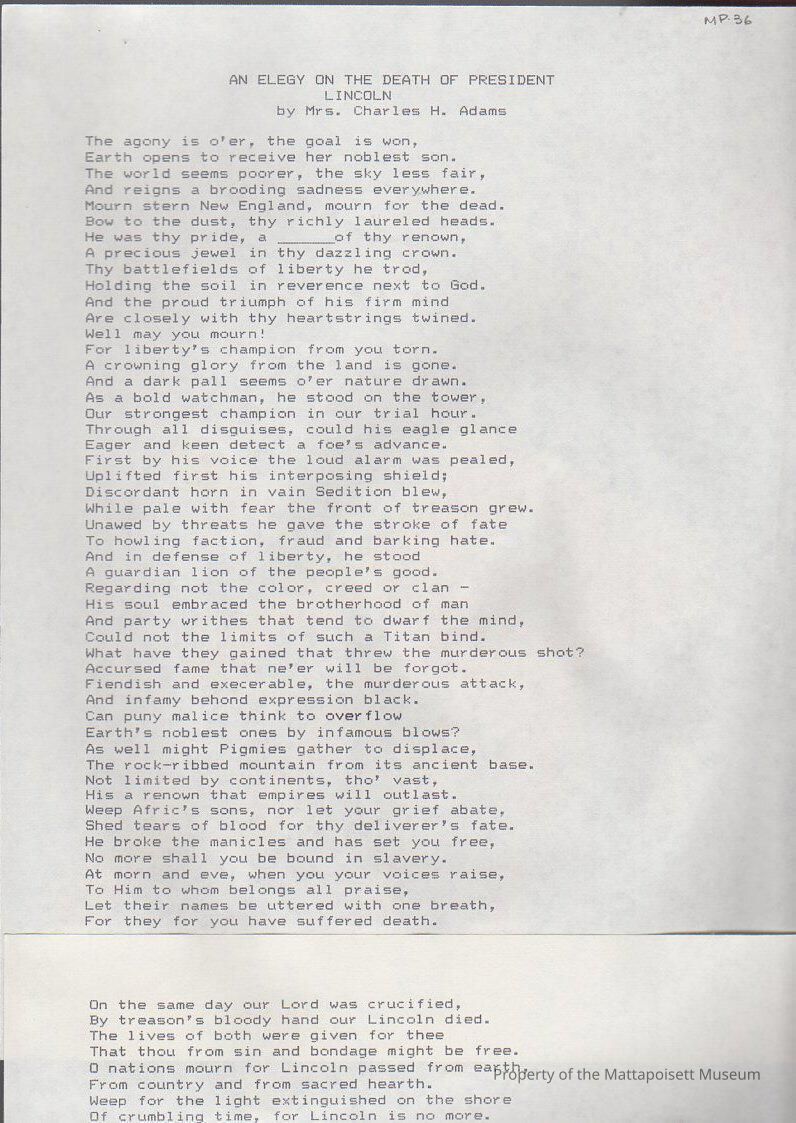 Transcript of "An Elegy on the Death of President Lincoln" by Mrs. Charles H. AdamsCollection