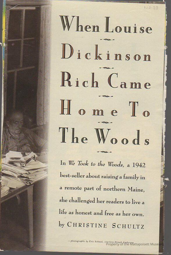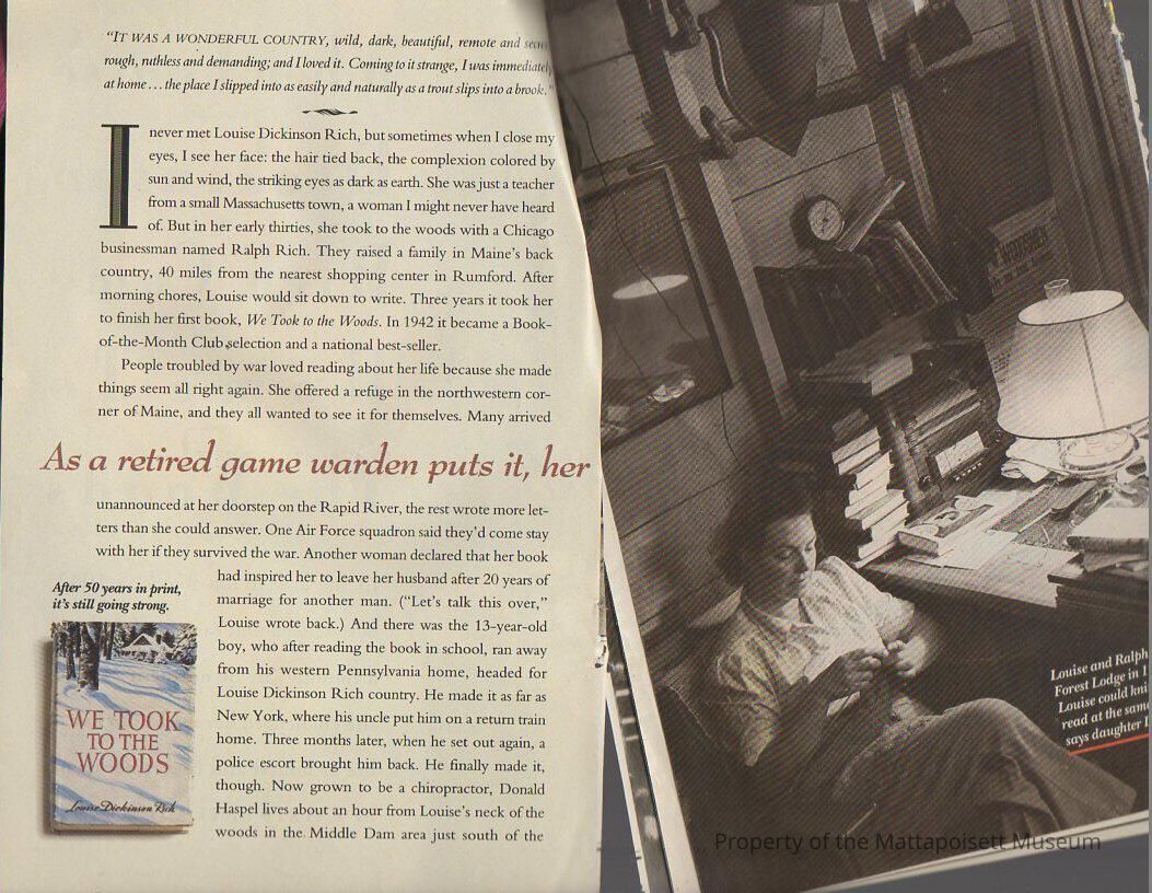 Magazine article "When Louise Dickinson Rich Came Home to the Woods", by Christine Schultz.Collection