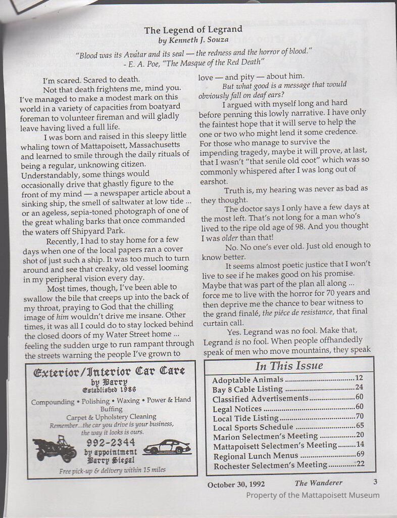 The Halloween edition of "The Wanderer", Vol. 1, No. 15, article "The Legend of Legrand" by Kenneth J. SouzaCollection